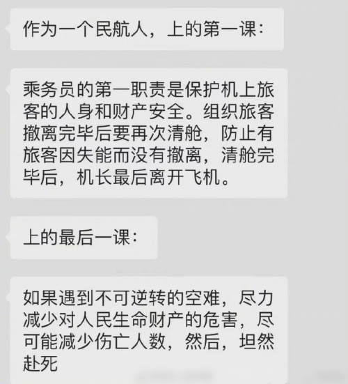 我实在是受不了空难发生后网上一堆蹭热度的,我澄清一下:民航在最后一课从未讲过坦然赴死,包括但不限于民航局颁布的飞行手册、客舱乘务员训练大纲、客舱乘务员手册等官方教材,其中都没有提及。