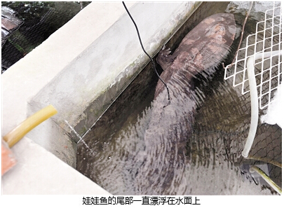 昨天,伍元春还说到了一个细节,在这两天的观察期间,曾经有一段时间,这条娃娃鱼把自己的尾巴“硬生生”地沉到了水底。也就是说,它还是能够控制自己这部分的躯体。但是过了一会,尾巴又浮了上来,“好像感觉把尾巴硬压在水底,让它有些难受似的。”伍元春说。