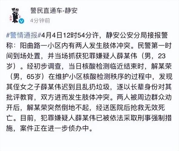4月4日12时54分许,静安公安分局接报警称:阳曲路一小区内有两人发生肢体冲突。民警第一时间到场处置,并当场抓获犯罪嫌疑人薛某伟(男,23岁)。经初步调查,当日核酸检测临近结束时,解某荣(男,65岁)在维护小区核酸检测秩序的过程中,发现其侄女之子薛某伟迟到且乱扔垃圾,遂以长辈身份对其批评教育,双方进而发生肢体冲突。两人被周边群众劝开后,解某荣突然倒地不起,经送医院后抢救无效死亡。目前,犯罪嫌疑人薛某伟已被依法采取刑事强制措施,案件正在进一步侦办中。(人民日报记者巨云鹏)