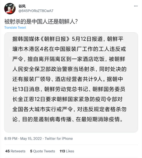 近日,一则关于朝鲜疫情的消息在推特、微信等平台流传。消息称,韩国媒体《朝鲜日报》在5月12日报道,有4名在中国工厂工作的工人因为违反戒严令、擅自外出用餐,被“朝鲜人民安全保卫部政治警察”当场射杀,包括工厂领导、酒店经营者在内的另外9人也被处决。
