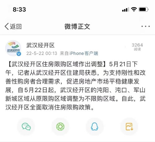 财联社5月22日电,今日凌晨,武汉经开区官方微博发布消息称,“为支持刚性和改善性购房者合理需求,促进房地产市场平稳健康发展,自5月22日起,武汉经开区的沌阳、沌口、军山新城区域从原限购区域调整为不限购区域。自此,武汉经开区全面取消住房限购政策。”目前,该条微博已被删除。