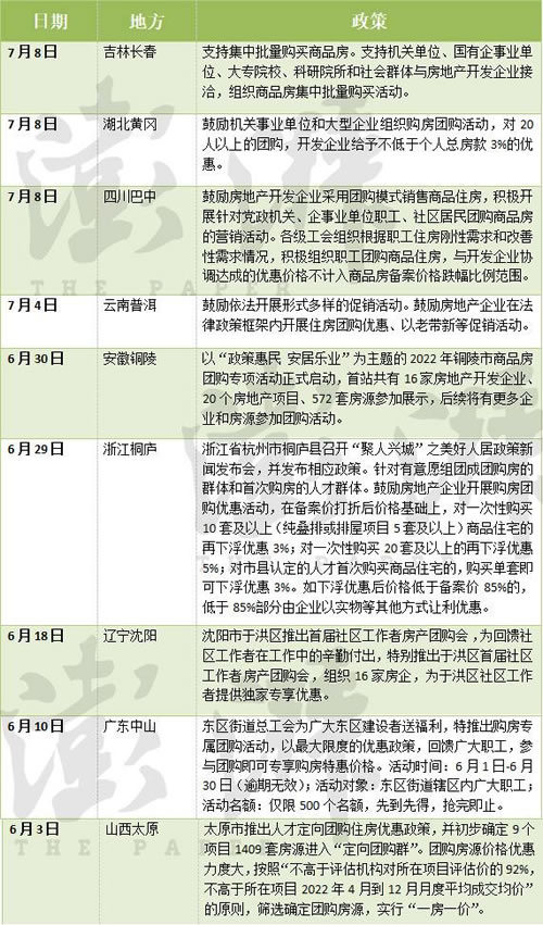 四川巴中则于7月4日印发《促进市中心城区房地产市场平稳健康发展若干措施》的通知,《通知》提到,鼓励房地产开发企业采用团购模式销售商品住房,积极开展针对党政机关、企事业单位职工、社区居民团购商品房的营销活动。各级工会组织根据职工住房刚性需求和改善性需求情况,积极组织职工团购商品住房,与开发企业协调达成的优惠价格不计入商品房备案价格跌幅比例范围。