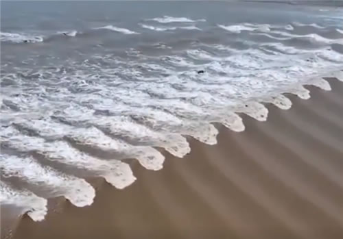 经观察,在鱼鳞潮产生之前,北南两股一线潮平行推进,南快北慢,后北潮斜向西南,并演变成波纹潮,速度加快,再与南潮交叉,在波纹潮的波峰。