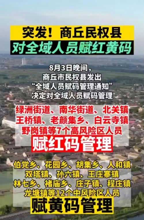【河南商丘民权县:对全域人员赋码管理】财联社8月4日电,据商丘日报消息,为做好疫情防控工作,经河南商丘民权县疫情防控指挥部研究决定,现对民权县全域人员赋码管理,其中绿洲街道、南华街道、北关镇、王桥镇、老颜集乡、白云寺镇、野岗镇等7个高风险区人员赋红码管理,伯党乡、花园乡、胡集乡、人和镇、双塔镇、孙六镇、王庄寨镇、林七乡、褚庙乡、庄子镇、程庄镇、龙塘镇等12个中风险区人员赋黄码管理。