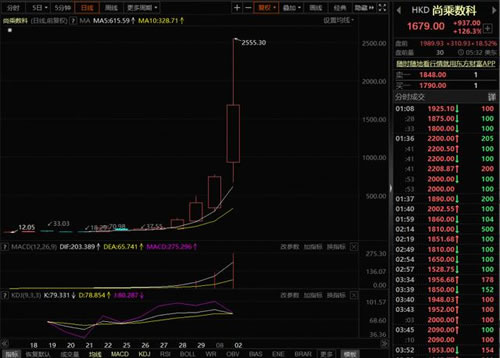 8月2日,上游新闻《上市半个月,股价涨幅超95倍!李嘉诚旗下这家公司表现太疯狂》稿件,吸引了众多读者的关注。而在8月3日,中概股尚乘数科的疯狂表现再度令人惊掉下巴。隔夜,在美上市的中概股尚乘数科继续着上市以来的疯狂表现,收盘大涨126.3%,报1679.00美元,市值3107亿美元,是美股阿里巴巴市值2452亿美元的1.3倍。盘中,尚乘数科最高价为2555.30美元。