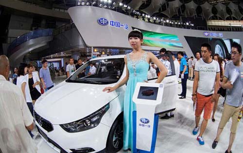 2015年7月12日,长春市汽博会某展台前,一名女子身着绿色长裙,站在一辆汽车前充当模特被发现。