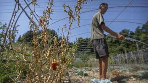 2022年8月20日,重庆,农民在用水管为自家农场里一株将要枯萎的辣椒浇水。人民视觉 资料