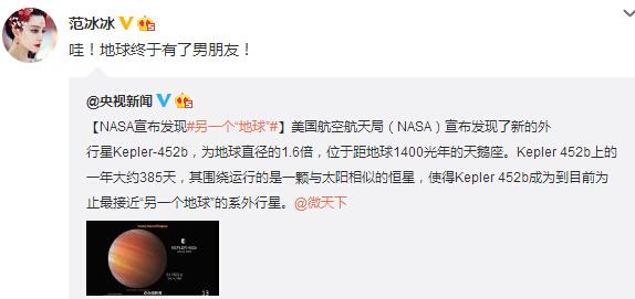 今日凌晨,美国航空航天局(NASA)宣布确认发现了“另一个地球”,消息引爆了舆论。连范冰冰也对这则新闻十分感兴趣,上午她转发了这则消息,并写道“哇!地球终于有了男朋友!”