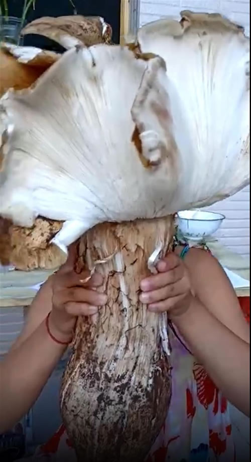 一名女童坐在小凳子上,十分吃力地举起一朵硕大的鸡枞菌,菌子的伞盖部分虽未撑开,但大到能完全遮住小孩的脸。在这条视频评论区,不少网友惊呼,第一次见到这么大的鸡枞菌,还有网友称其为“鸡枞王”。