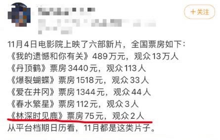 据橙柿互动消息,前几天,有网友爆料说,上周五(11月4日)当天上映的六部新片中,有一部叫《林深时见麓》电影,其一天票房仅75元,两个观众。