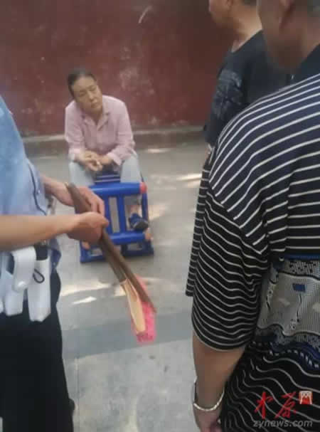打人老太坐在仰卧起坐的健身器材上,竟称打人属正当防卫。