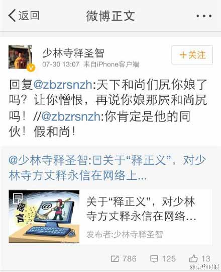 30日上午,@少林寺释圣智 在个人微博上发布《关于7月25日署名“释正义”,对少林寺方丈释永信在网络上造谣》的文章,称7月25日有自称“释正义”的人在网上恶意诋毁、诽谤少林寺方丈大和尚;由于少林寺及方丈的知名度,引起各大网站的跟帖转载给少林寺方丈本人及少林寺、佛教界造成极大的负面影响。