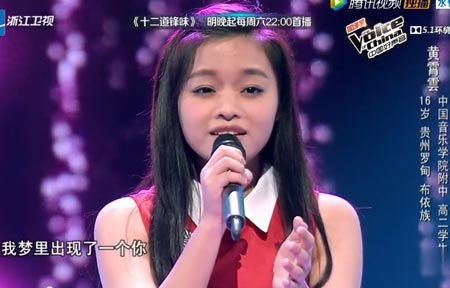 中国好声音第4季第三期今晚热播!其中来自中国音乐学院附二中的高二学生十六岁的黄霄云带来一首雨神的《你》惊艳全场!黄霄雲《你》有点惊为天人的感觉,少数民族果然是歌唱天赋卓越。中国音乐学院附中竟然能教出来这种唱流行摇滚毫无做作感违和度的人,唱流行毫无辨识度的假唱天后姚贝娜在这位小校友面前就像个丫鬟。耳测D5拔长质量还行,雨神的这首歌有了值得收藏的女声版了!