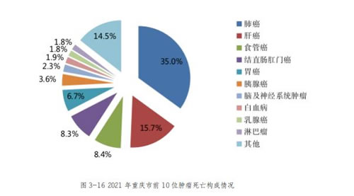 2021年,重庆市报告死亡个案共计222378例,较上年降低了3.50%。位居第一的死因是慢性病,占91.53%,其次是伤害,占5.61%;第三是感染性、母婴和营养缺乏病占2.85%。主要的四种慢性病中,粗死亡率最高的是心脑血管疾病,占全部死亡个案的43.02%;粗死亡率排名第二的是恶性肿瘤,占24.88%;粗死亡率排名第三的是慢性呼吸系统疾病,占12.67%;第四是糖尿病,占2.45%。