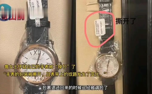 待包裹返还时,鲁女士怀疑自己的手表被"掉包"了," 手表的包装、标签被撕开,表带的纹路也和我寄出去的不一样 "。