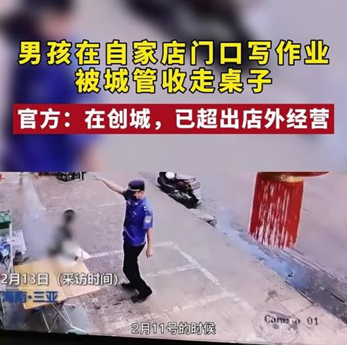 近日,三亚一女子在自家的超市门口前,摆放了一张桌子,让儿子写寒假作业,不料被城管看到后,让写作业的男孩起来,没收了桌子和椅子。事后,城管对此回应称,系该商户多次违反门前三包责任,不存在暴力执法行为。当地正在创城,门口不允许摆任何物品。