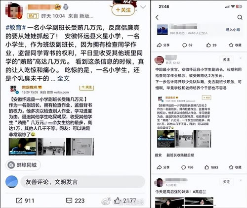 网传内容提到:安徽怀远县火星小学,一名小学生,作为班级副班长,因为拥有检查同学作业、监督同学背书的权力,平日里收受其他班里同学的“贿赂”高达几万元。还附上了相关的图片。