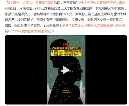 近日,在河南濮阳,张某出车祸后想要上大学的女儿回来陪护,女儿没来还将其拉黑,张某于是起诉女儿,要其每月支付赡养费1500元。女儿称,自己还在上学没有能力支付赡养费也没时间陪护,且家中有两个哥哥照料。拉黑父亲,则是因为父亲一直在抱怨。法院:张父诉求不予支持。