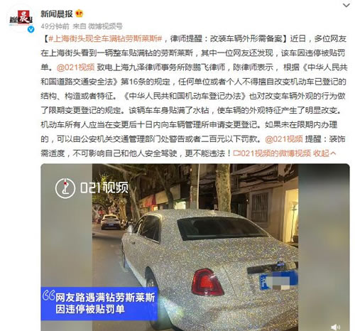 【上海街头现全车满钻劳斯莱斯,律师提醒:改装车辆外形需备案】近日,多位网友在上海街头看到一辆整车贴满钻的劳斯莱斯,其中一位网友还发现,该车因违停被贴罚单。@021视频致电上海九泽律师事务所陈鹏飞律师,陈律师表示, 根据《中华人民共和国道路交通安全法》第16条的规定,任何单位或者个人不得擅自改变机动车已登记的结构、构造或者特征。《中华人民共和国机动车登记办法》也对改变车辆外观的行为做了限期变更登记的规定。