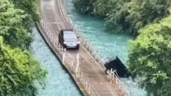 网传事发时的视频显示,涉事车辆前方还有一辆车在打着双闪,涉事商务车离前车有数十米的距离,其车头突然转向,撞上了一侧的栏杆,车辆倾斜车头触水,随后整车落入水中。