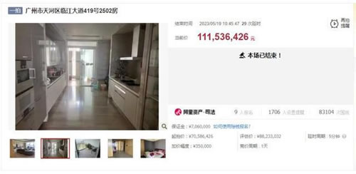 据上游新闻5月22日消息,5月18日至19日,广州市天河区人民法院在阿里资产平台上拍卖广州市天河区临江大道419号2502房(住宅),起拍价7058.6426万元,9人报名,经过53次竞价,最终以1.11536426亿元成交。