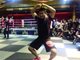 你看那个慢镜头,显示站立的时候虽然我退避但一拳都没(被)打到。实际上是他那个是软的橡胶地面,那个应该是光脚训练的场地,我们两个当时都穿着鞋,我的鞋磨了一下把我绊倒了,所以才输了。这个解释起来没什么意思,但对我来说是这么一个事实。如果有一个喘息的机会,有诸多可能吧,比赛就是这样,电光火石之间。